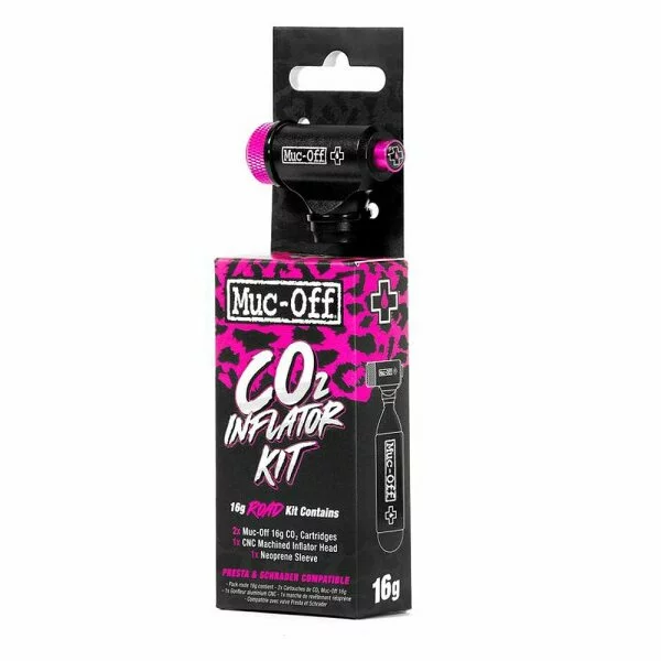 Muc Off CO2 Alu Pumpenkopf im Set mit 2x 16gr CO2 Kartuschen und einem Neopren Überzug gegen die Kälte beim Befüllen.